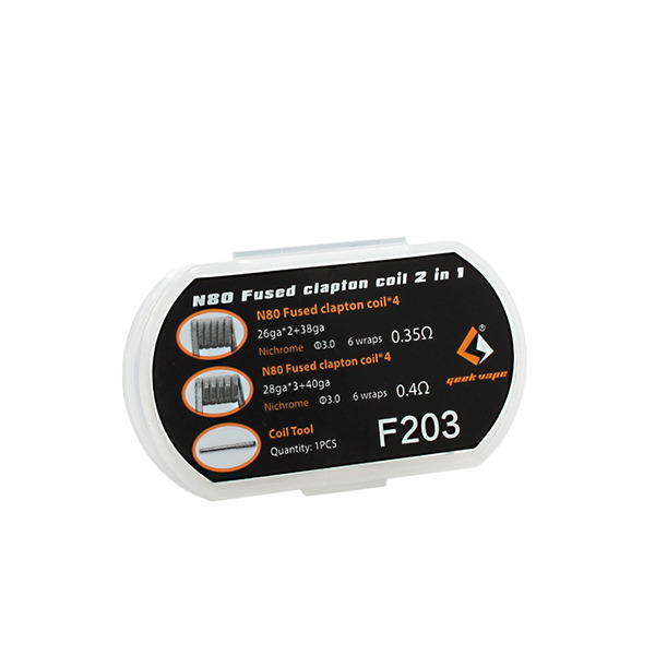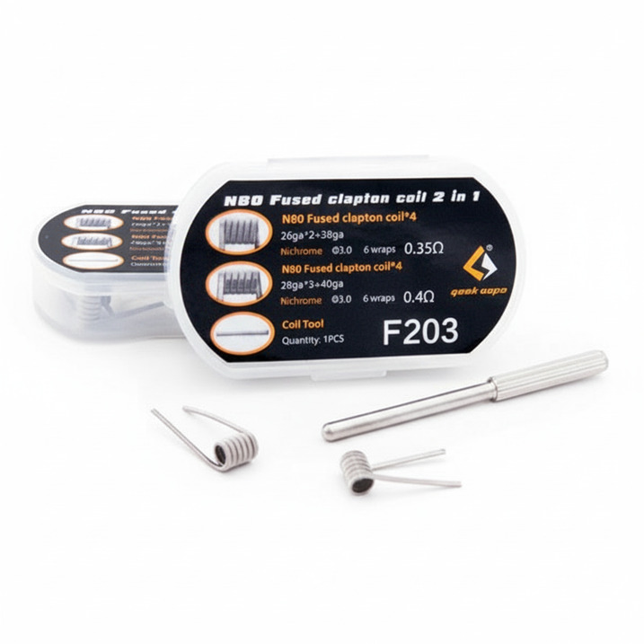 F203 coils by GeekVape are prebuilt fused Clapton nickel N80 coils supplied in a plastic case. Each pack includes eight coils (mix of 0.35Ω and 0.4Ω) and a steel fixing tool when bought as a full set , a tidy choice for RTA and RDA builders in Dubai and across the UAE.