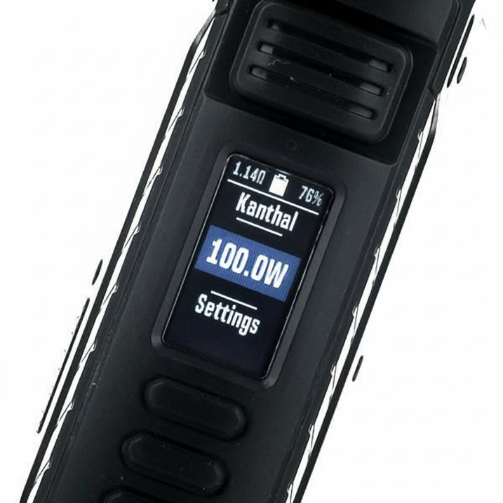 - Displays: output wattage, atomizer resistance, battery level, puff count