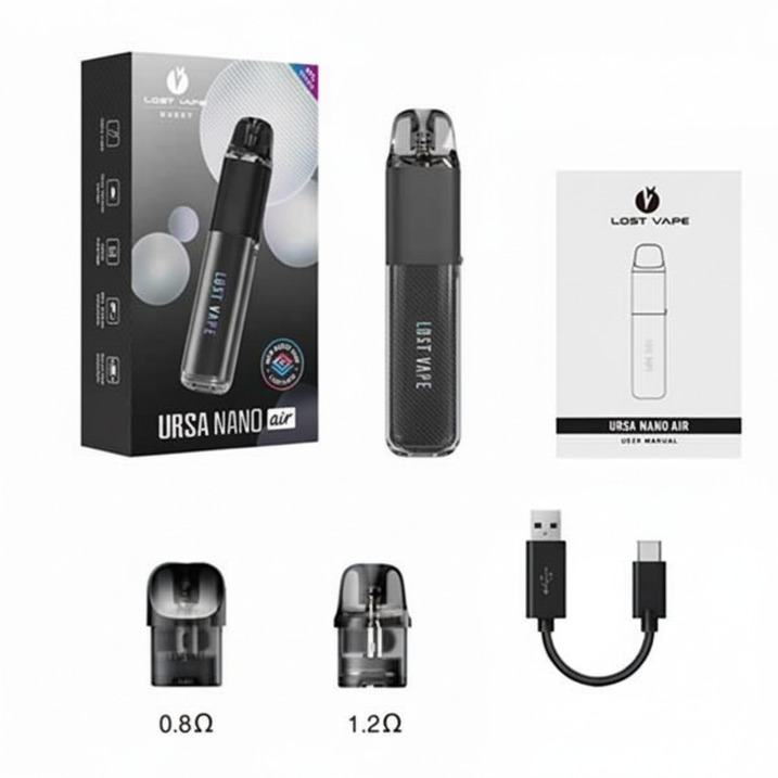 The package is ready to go from day one: you get the Ursa Nano Air pod device, two different resistance URSA cartridges (0.8Ω and 1.2Ω), a Type-C charging cable and a user manual. The USB-C port makes charging simple and fast compared with older cable types, and the 800mAh battery is sized to cover routine daily use. Overall, this Lost Vape pod system is a polished, user-friendly choice for anyone in the UAE seeking a compact MTL pod with smart styling and dependable everyday performance.