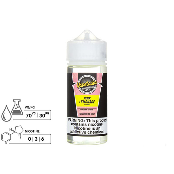 Vapetasia Pink Lemonade 100ML E-Liquid is a summer-ready juice mixing zesty lemonade with sweet raspberries in a 100ml bottle,available in several nicotine strengths and made in the USA.