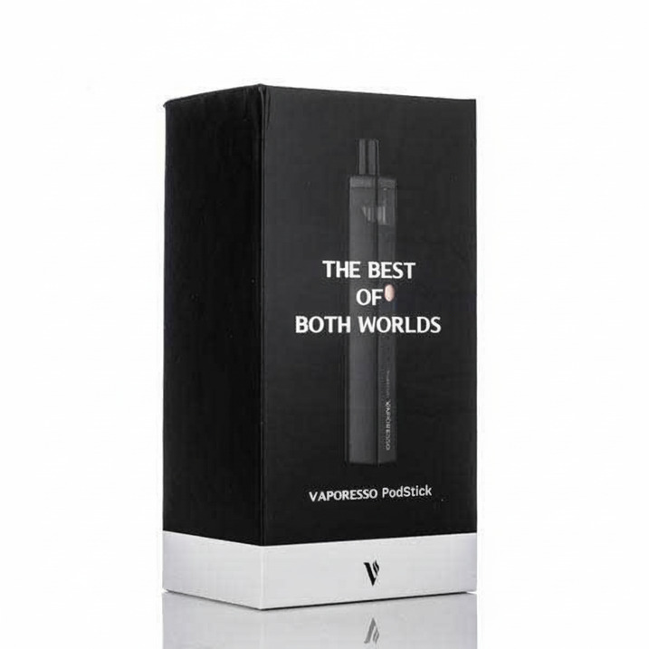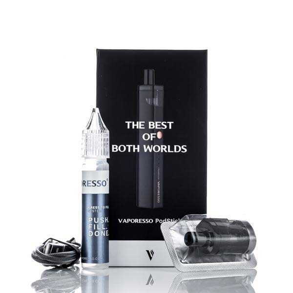 The Vaporesso PodStick Pod System is a slim, pen-style refillable pod kit from Vaporesso. It comes with two 2ml refillable pods (one Mesh 0.6Ω and one CCELL 1.3Ω), a built-in 900mAh battery, OMNI Board Mini chipset with three output modes and LED battery indicator, plus Micro USB charging and a simple sliding fill port.