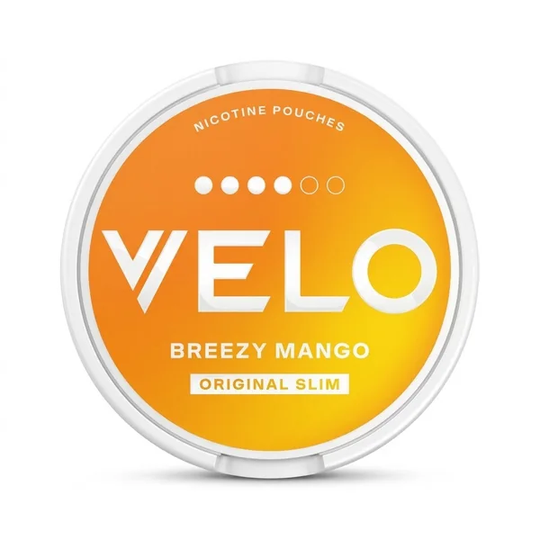 VELO Breezy Mango Nicotine Pouches offer a moist mango flavor in a Swedish-made can with 20 pouches, designed for a clean and convenient pouch experience.